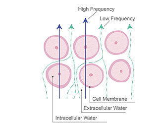 傳統BIA儀器運用單頻率推算體組成,而事實上除了最常用的50kHz以外,其他高低頻率能讓儀器進行更精準的分析。低頻率能協助儀器分析細胞外水分,而高頻率的穿透性使儀器也有辦法量測細胞內水分。許多疾病都和水分有關,因此參考性高的水分計算為生物阻抗分析的關鍵。