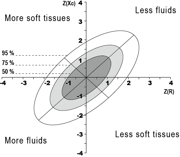 然而,許多疾病都會影響體水分,這時必須運用生物阻抗矢量分析 (Bioelectrical Impedance Vector Analysis / BIVA) 進行體水分追蹤。BIVA運用組成阻抗的電阻和電抗,將受測者的結果直接和對應族群比較后以圖標表現細胞及水分的狀態,因此水分異常的受測者也能使用。